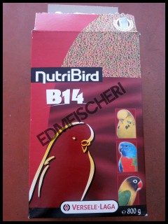 80% - Pienso estursionado Nutribird B - 14 (Versele Laga). Pienso de mantenimiento. En época de cría se sstituirá por B - 18, más proteíco que el actual.
